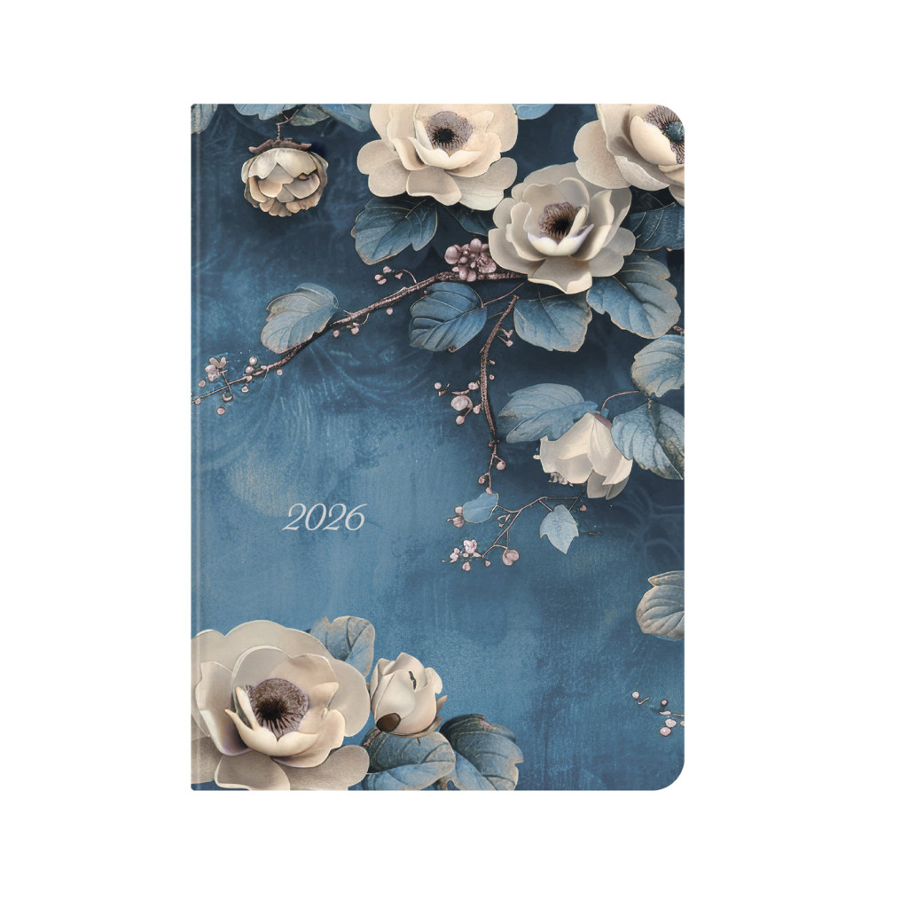Színes grafikával díszített, matt fóliával bevont, fehér tömbös heti naptár, jelzőszalaggal.