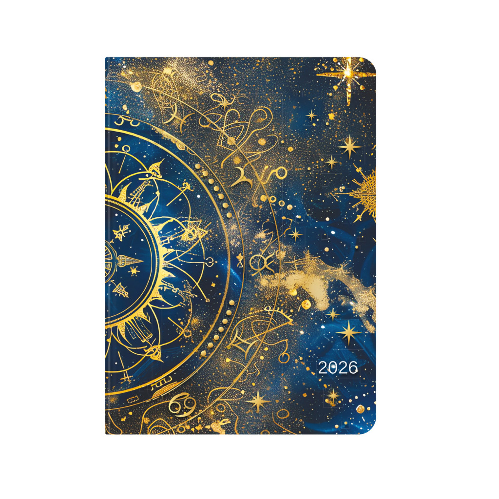 Színes grafikával díszített, matt fóliával bevont, fehér tömbös heti naptár, jelzőszalaggal.