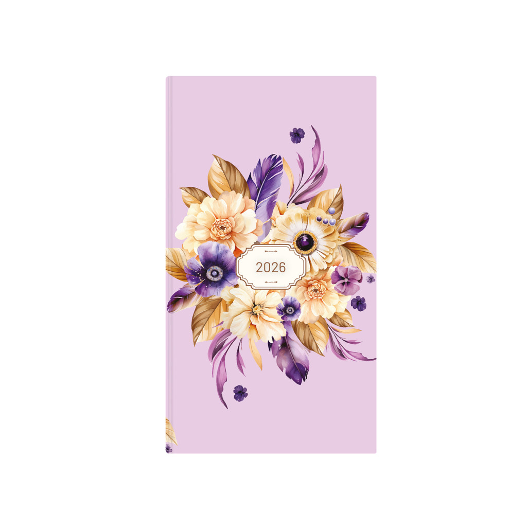 Színes grafikával díszített, matt fóliával bevont, fehér tömbös zsebnaptár, jelzőszalaggal.