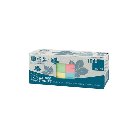 Jegyzettömb öntapadó, Info Notes 75x75mm, "Z" 12x100lap, újrahasznosított 5644-88 pastell mix, kék, zöld, rózsaszín, sárga